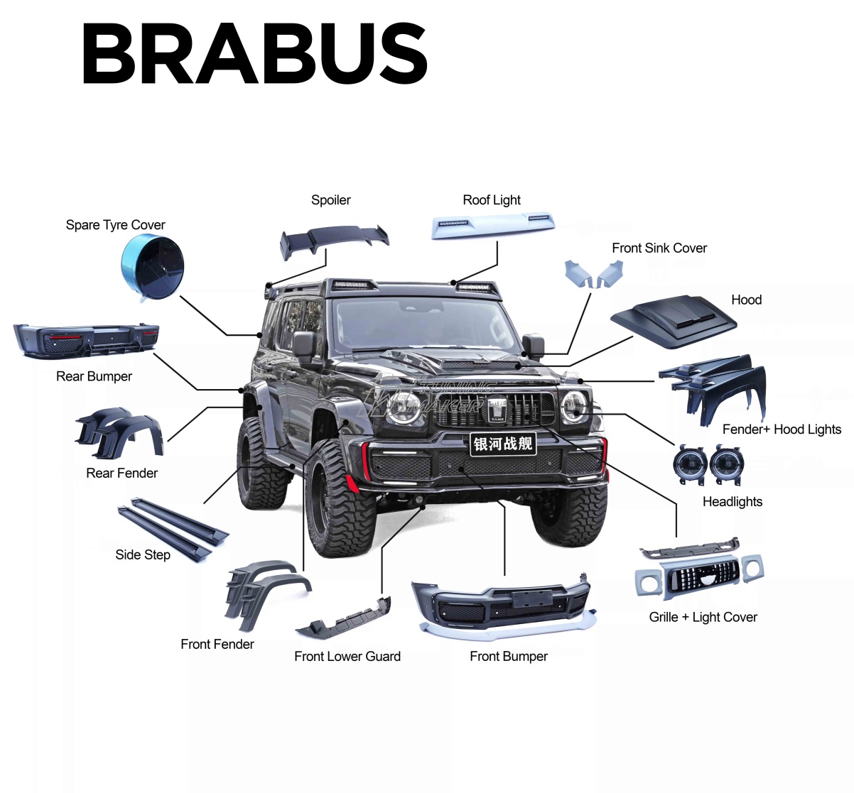 Аэродинамический тюнинг обвес Brabus G63 для Tank 300 2023+ – это уникальная возможность перевоплотить ваш внедорожник в премиальный и эффектный Гелендваген Brabus G63. Комплект разработан специально для автомобиля Tank 300, начиная с 2023 года выпуска и новее, обеспечивая идеальную посадку и гармоничность всех элементов. Купить обвес для Tank 300 – значит выбрать максимальный стиль и эксклюзивность, которые не оставят ваш автомобиль незамеченным.