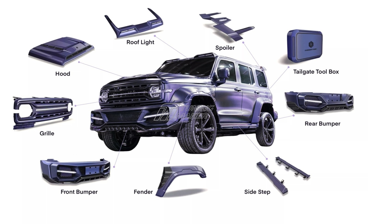 Все элементы обвес для TANK 300 выполнены из прочного и качественного пластика, комплект поставляется неокрашенным, позволяя вам идеально подобрать цвет для вашего автомобиля. Купить тюнинг обвес Shadow Tank означает инвестировать в яркий стиль и функциональность, подчеркнув эксклюзивность и характер вашего внедорожника Tank 300.