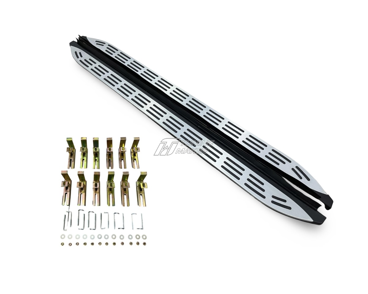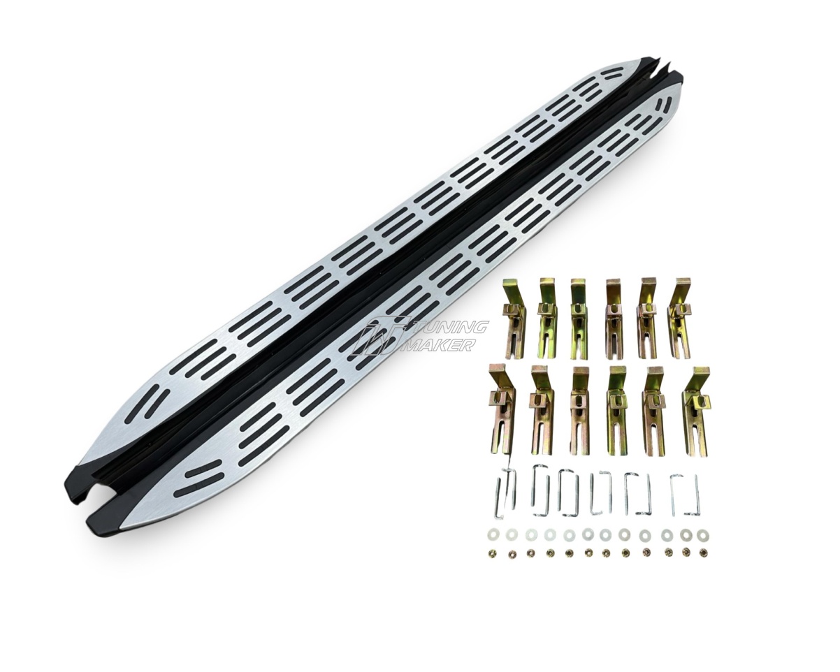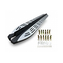 В комплекте поставляются два боковых порога, надежные стальные крепления и болты. Установка производится стандартным методом прикручивания на болтовые соединения, что позволяет без сложностей заменить штатные пластиковые элементы под дверями без модификаций кузова.