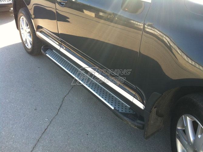 Эта модель порогов является одной из самых популярных моделей среди автомобильных подножек. Эти ступеньки предусмотрены для установки на Volkswagen Touareg, так как крепежные кронштейны разработаны специально под авто. Никаких сверлений и изменений в кузове автомобиля не требуется! Помимо своих прямых предназначений подножек, выполняют некоторые эстетическую и защитную функции. Поставляется в комплекте из двух порогов, кронштейнов для крепления и инструкции по установке.