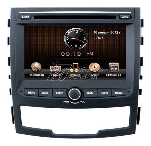 Потрясающая штатная мультимедийная система Intro CHR-7769SY, с великолепным дисплеем высокого разрешения на автомобили Yong Actyon (2011-2013). Самые полезные функции, которые необходимы в автомобиле, собраны в данной головной системе. Интернет, GPS навигация, Bluetooth (свободные руки),USB, HDD, SD card, подключать iPhone и iPod, все популярные видео и аудио форматы, а так же подключать камеры заднего и переднего обзора - все эти функции станут доступны с установкой данного аппарата в ваш автомобиль. Дизайн устройства, выполненный в традиционном стиле SsangYong, четко вписывается в интерьер автомобиля.