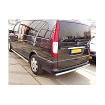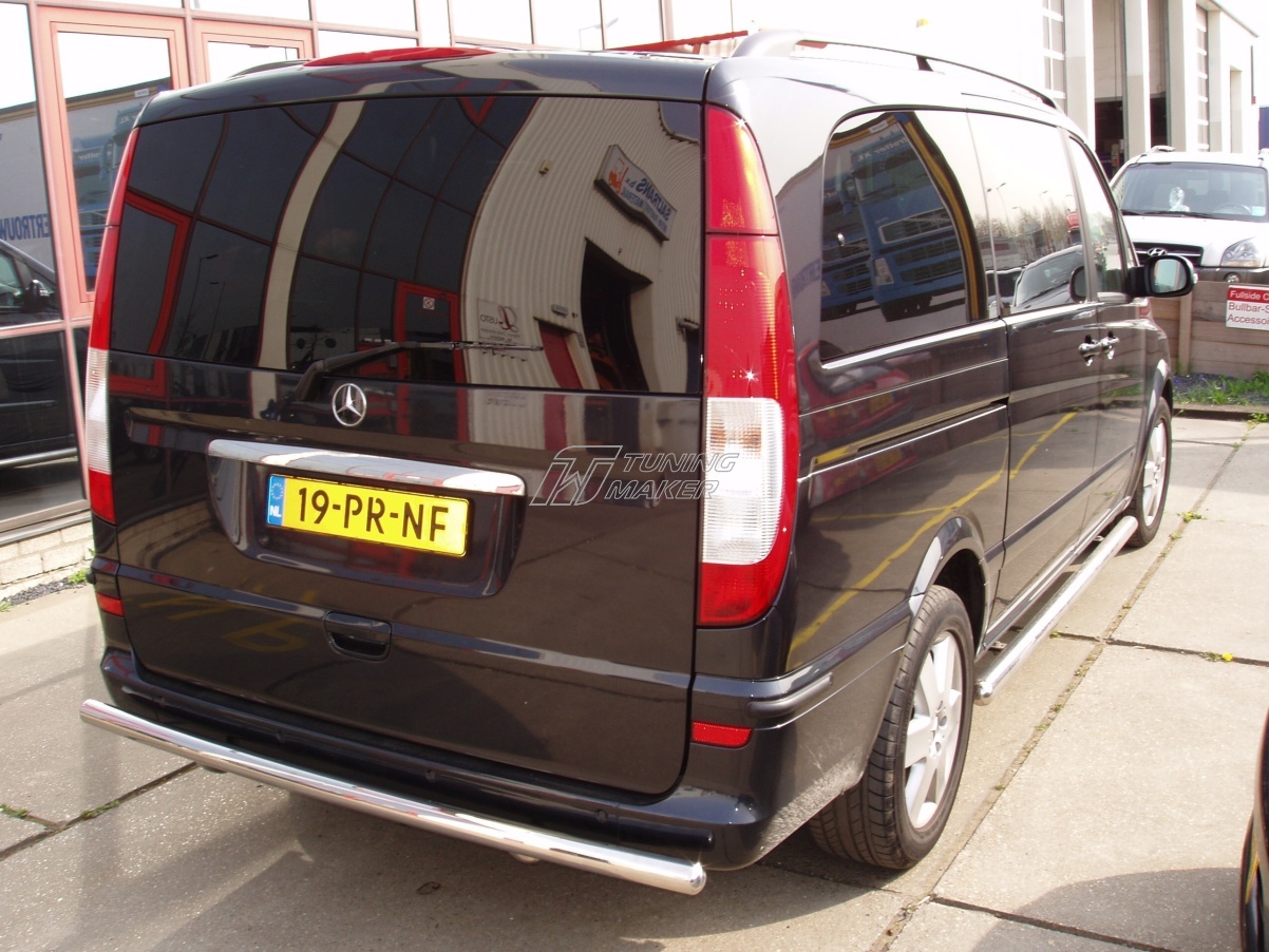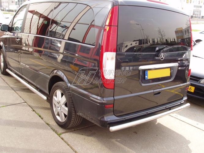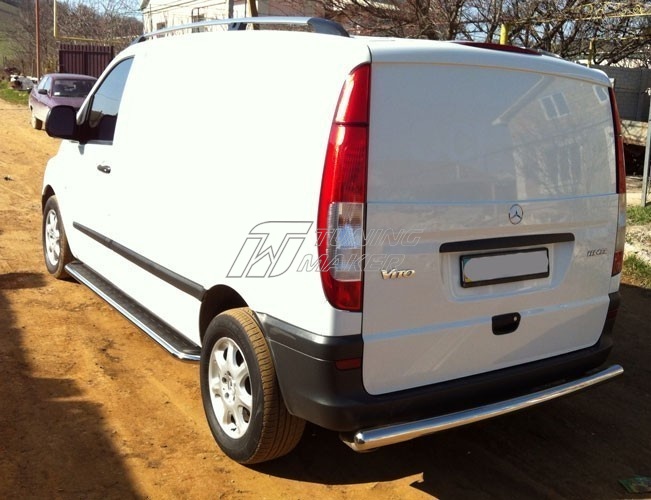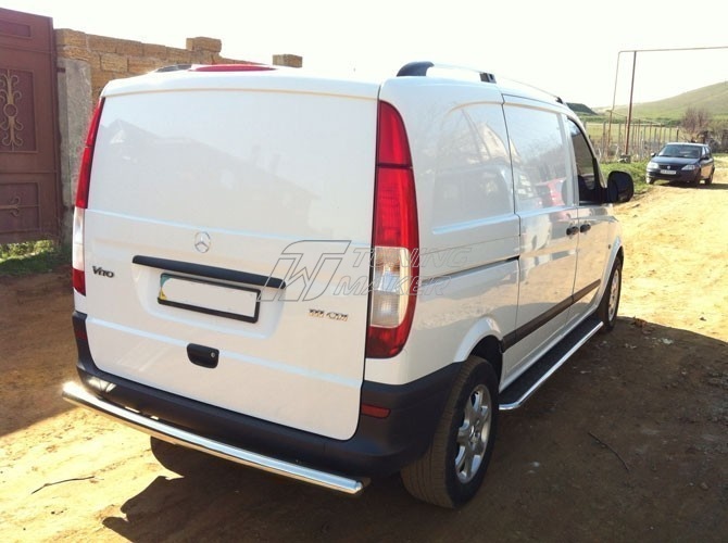Задняя защита Mercedes Vito в виде трубы по заднему бамперу. Разработана специально для Vito в кузове W639 и устанавливается четко в штатные места крепления, предусмотренные заводом-изготовителем Mercedes-Benz специальными кронштейнами. Материал защиты бампера - нержавеющая полированная сталь достаточной толщины, гарантирует стойкость элементов защиты по заднему бамперу к деформациям и царапинам.