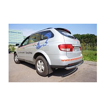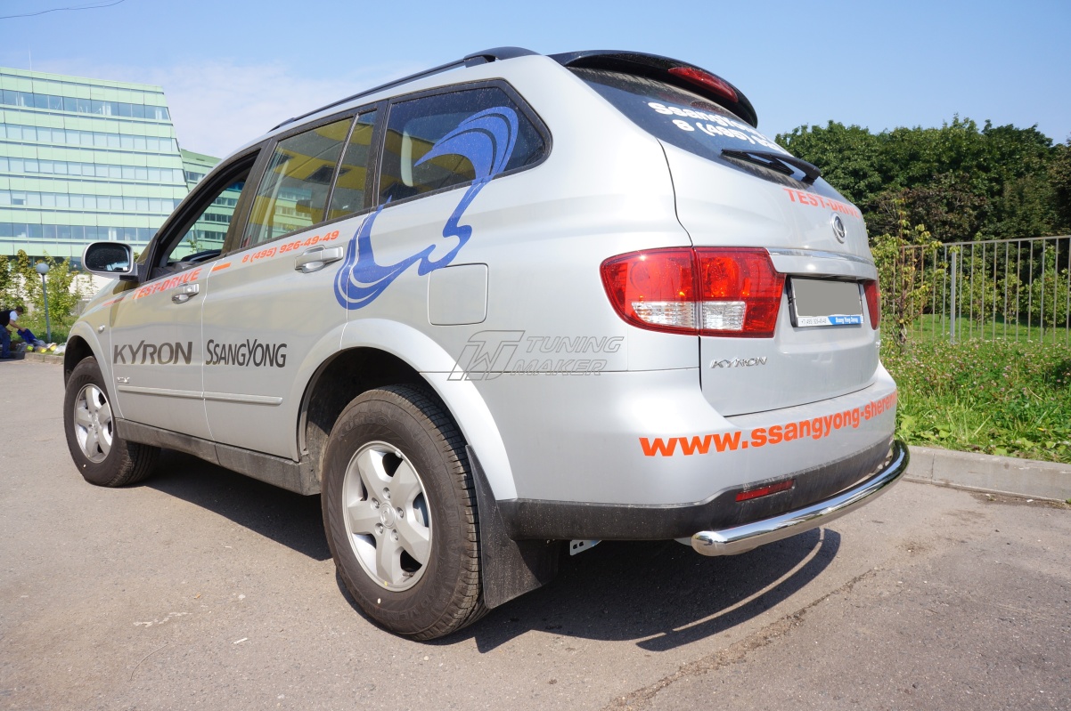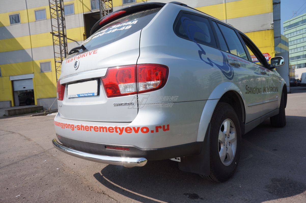 Задняя защита SsangYong Kyron в виде трубы по заднему бамперу. Разработана специально для SsangYong и устанавливается четко в штатные места крепления, предусмотренные заводом-изготовителем специальными кронштейнами. Материал защиты бампера - нержавеющая полированная сталь достаточной толщины, гарантирует стойкость элементов защиты по заднему бамперу к деформациям и царапинам.