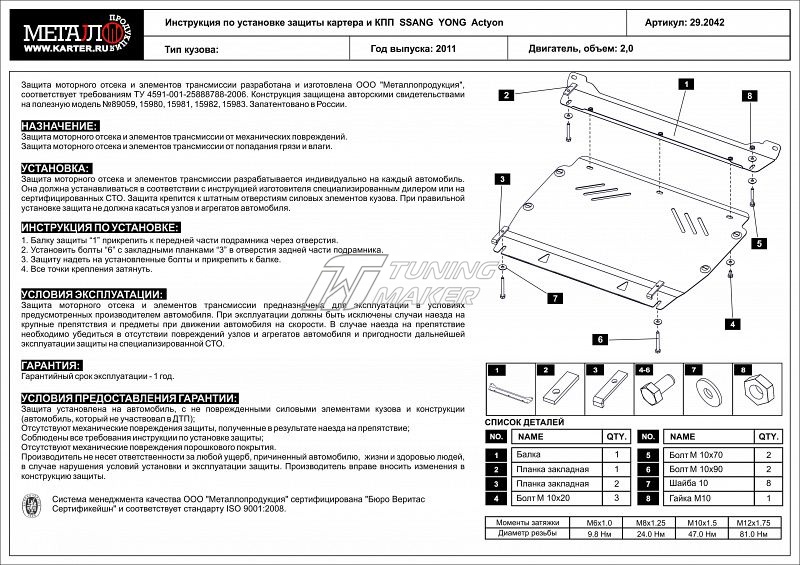 Защита картера КПП, Ssang Yong Actyon 2013-, V - все/Ssang Yong Actyon 2011-2013, V - все