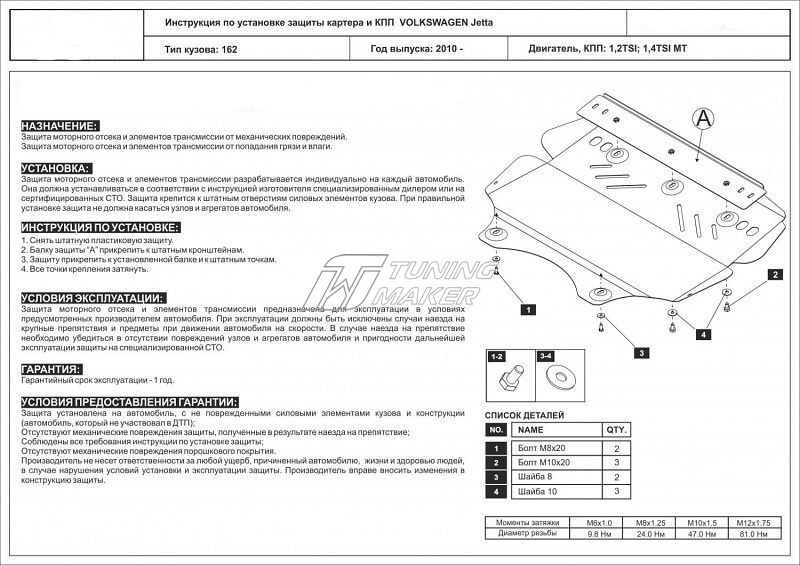 Volkswagen Jetta 162 с 2010 по 2018 двигатель 1,2TSI, 1,4TSI 1,6, 2.0 Защита картера и КПП сталь 2 мм
